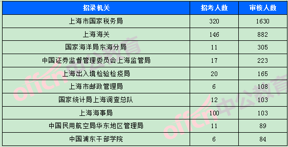 報(bào)名通過審核人數(shù)前十的職位主要集中在上海市國家稅務(wù)局、上海海關(guān)等部門,具體信息如下: