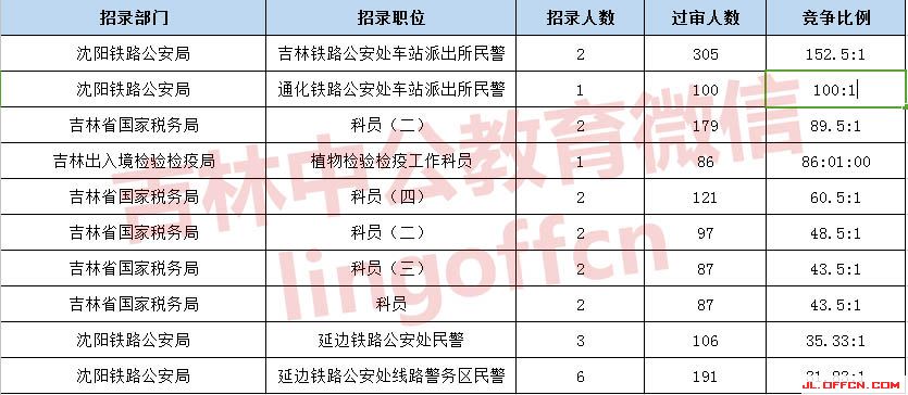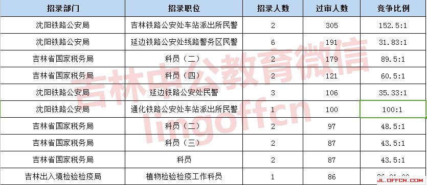 報(bào)名通過(guò)審核人數(shù)前十的職位主要集中在沈陽(yáng)鐵路公安局、吉林國(guó)家稅務(wù)局、吉林出入境檢疫檢驗(yàn)局等部門(mén),具體信息如下: