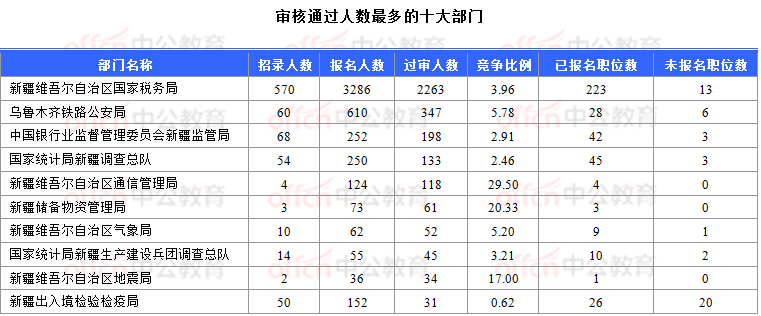 為幫助廣大考生更清晰的了解今日?qǐng)?bào)名情況,中公網(wǎng)校整理了審核通過人數(shù)前十位的部門以及競(jìng)爭(zhēng)比例最激烈的十大部門,供廣大考生參考:
