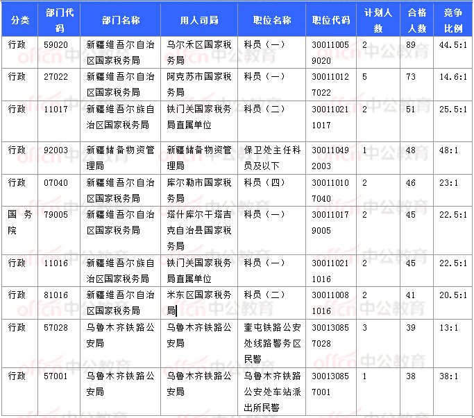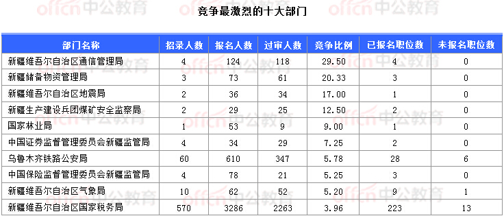 報(bào)名通過審核人數(shù)前十的職位主要集中在新疆儲(chǔ)備物資管理局、新疆維吾爾自治區(qū)國(guó)家稅務(wù)局、烏魯木齊鐵路公安局、新疆維吾爾族自治區(qū)通信管理局,具體信息如下: