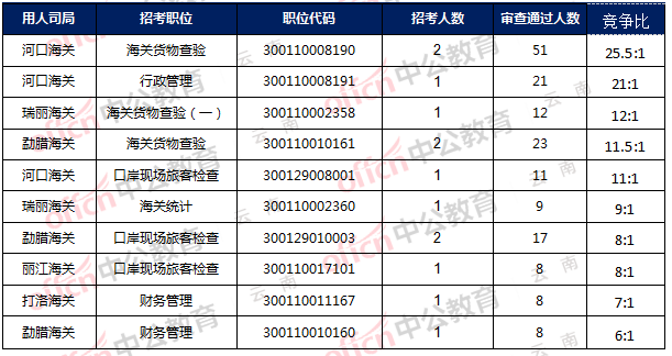 2018國家公務員海關報名人數(shù)截止11月1日河口海關,職位代碼:300110008190,招錄2人,審查通過人數(shù)為51人,暫時競爭比為25.5:1,具體信息如下: