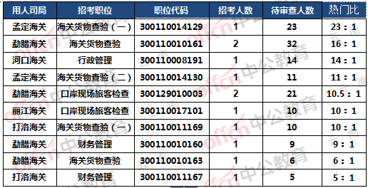 當前孟定海關職位代碼300110014129的崗位相比報名人數(shù)為多,招1人,23人報名待審,熱門比為:23:1