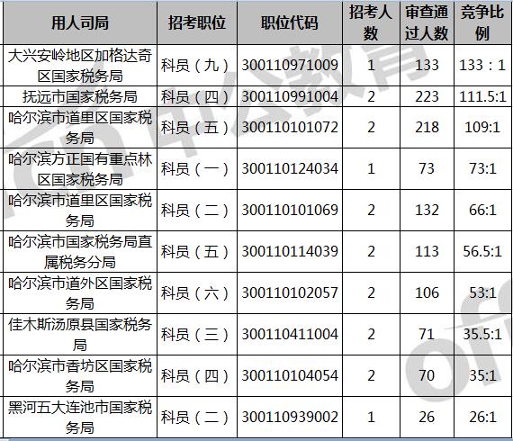 由于黑龍江省國家稅務(wù)局整體招錄人數(shù)比較多,所以部門整體競爭比例比較小,但從招錄人數(shù)最多的和競爭比例的職位來看,前三名都集中在該部門。當(dāng)前是大興安嶺地區(qū)加格達(dá)奇區(qū)國家稅務(wù)局職位代碼300110971009的崗位競爭比例,達(dá)133:1。