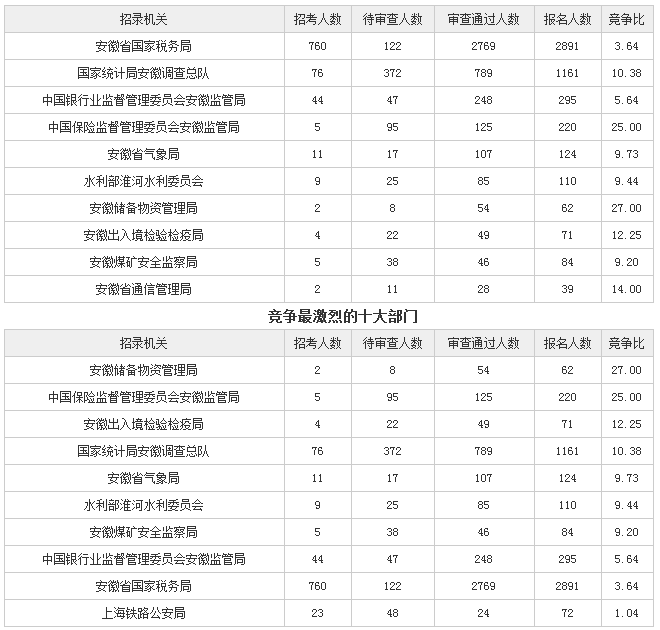 截止到11月1日18時(shí),通過審核人數(shù)前三位的部門依次是:安徽省國(guó)家稅務(wù)局、國(guó)家統(tǒng)計(jì)局安徽調(diào)查總隊(duì)、中國(guó)銀行業(yè)監(jiān)督管理委員會(huì)安徽監(jiān)管局,三部門通過審核總?cè)藬?shù)達(dá)1835人,占通過審核總?cè)藬?shù)的87%。