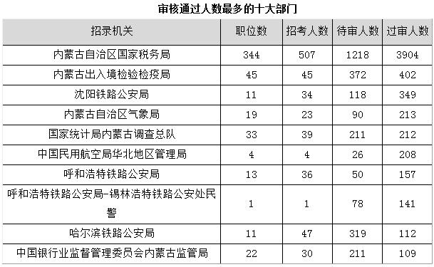 截止到11月1日16時,通過審核人數(shù)前三位的部門依次是:內(nèi)蒙古自治區(qū)國家稅務局、內(nèi)蒙古出入境檢驗檢疫局、沈陽鐵路公安局,三部門通過審核總?cè)藬?shù)達4655人,占通過審核總?cè)藬?shù)的73.59%。