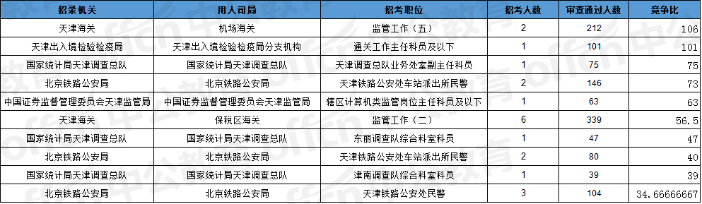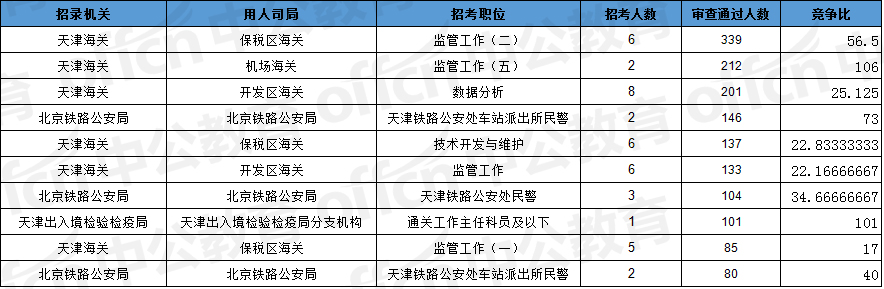 報名通過審核人數(shù)前十的職位主要集中在天津海關、北京鐵路公安局、天津出入境檢驗檢疫局等部門,具體信息如下:
