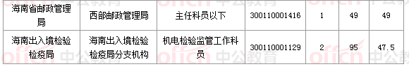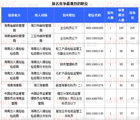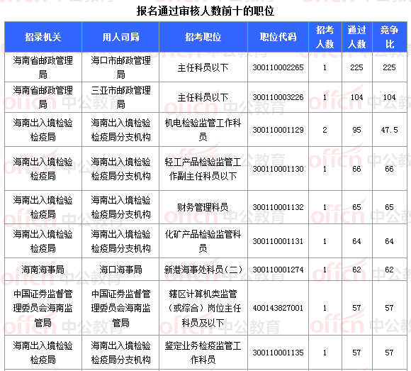 報(bào)名通過(guò)審核人數(shù)前十的職位主要集中在海南省郵政管理局、海南出入境檢驗(yàn)檢疫局、海南海事局等部門,具體信息如下:
