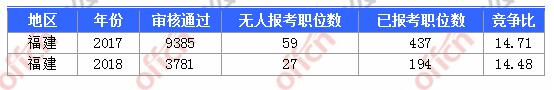 截至11月2日16時(shí),據(jù)中公教育統(tǒng)計(jì),國(guó)考職位中工作地點(diǎn)在福建的職位2826人待審,3781人通過審核,共報(bào)名6607人,其中有27個(gè)職位無人報(bào)名,平均競(jìng)爭(zhēng)比例為14.48:1。