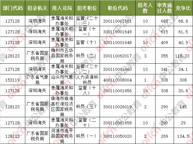報(bào)名通過(guò)審核人數(shù)前十的職位主要集中在深圳海關(guān)、廣東省國(guó)家稅務(wù)局、廣東省氣象局等部門(mén),具體信息如下:
