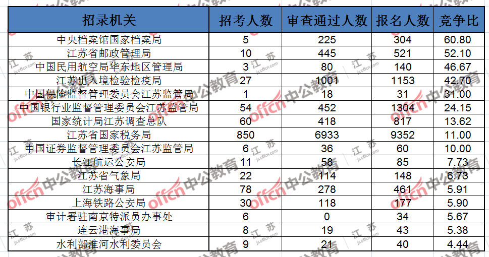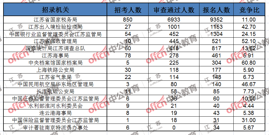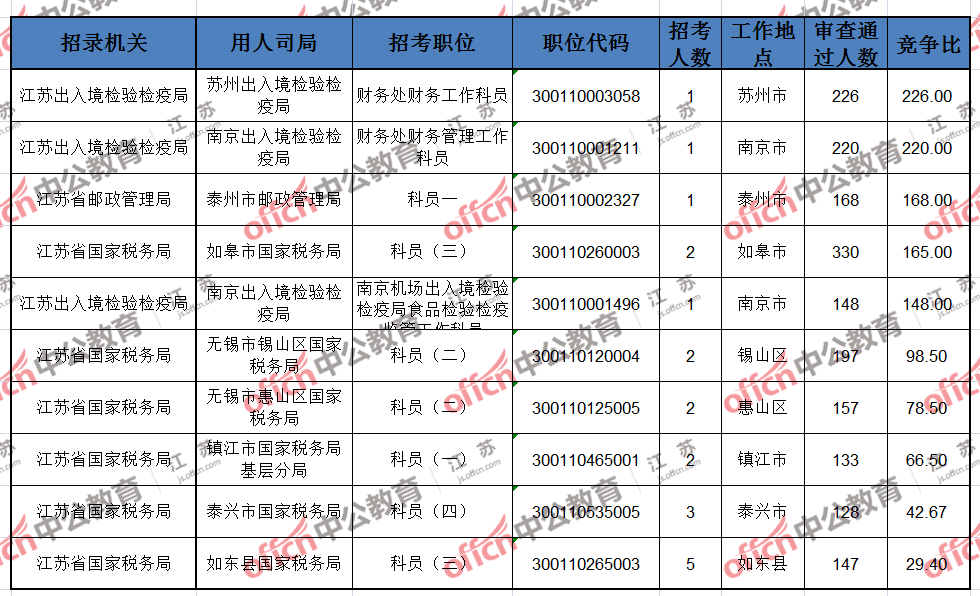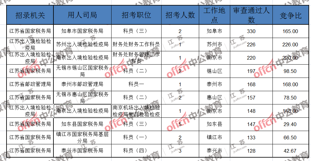 報(bào)名通過審核人數(shù)前十的職位主要集中在江蘇出入境檢驗(yàn)檢疫局、江蘇省郵政管理局、江蘇省國家稅務(wù)局等部門,具體信息如下: