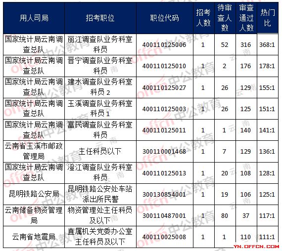當前最受歡迎的崗位是國家統(tǒng)計局云南調(diào)查總隊,麗江調(diào)查隊業(yè)務科室科員,職位代碼:400110125006