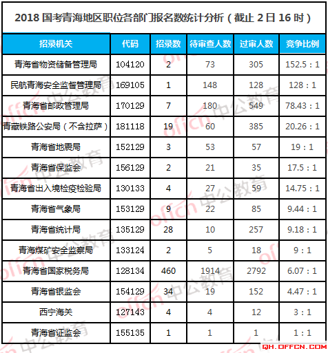 以下是2日16時各部門報名人數(shù)統(tǒng)計分析,其中青海省物資儲備管理局、中國民航青海安全監(jiān)督管理局、青海省郵政管理局等三個部門競爭最激烈,競爭比均超過78:1。