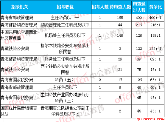 截至到2日16時,競爭比例的職位為青海省郵政管理局主任科員以下一職,招錄1人,截至到2日16時審核通過人數(shù)為400人,是此次國考青海地區(qū)競爭比例的一個職位!