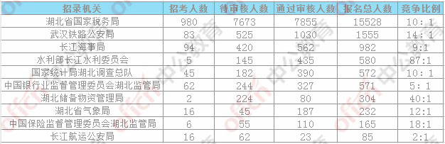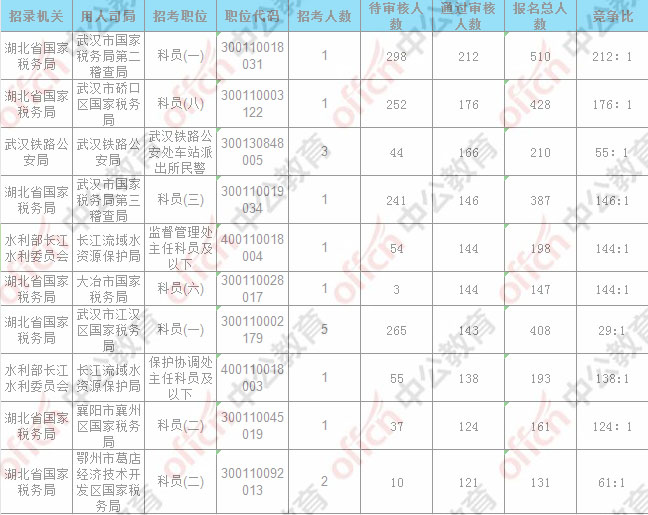 報名通過審核人數(shù)前十的職位主要集中在湖北省國家稅務局、武漢鐵路公安局等部門,具體信息如下: