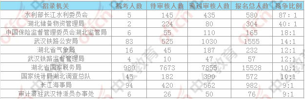截止到11月2日16時,報名人數(shù)排名前三位的部門依次是:湖北省國家稅務局、武漢鐵路公安局、長江海事局,三部門通過審核總人數(shù)達9447人,占通過審核總人數(shù)的84.7%。