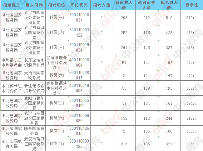 截止到2日16時,競爭比例的職位為武漢市國家稅務局第二稽查局科員(一)一職,招錄1人,截止到2日16時通過人數(shù)為212人。