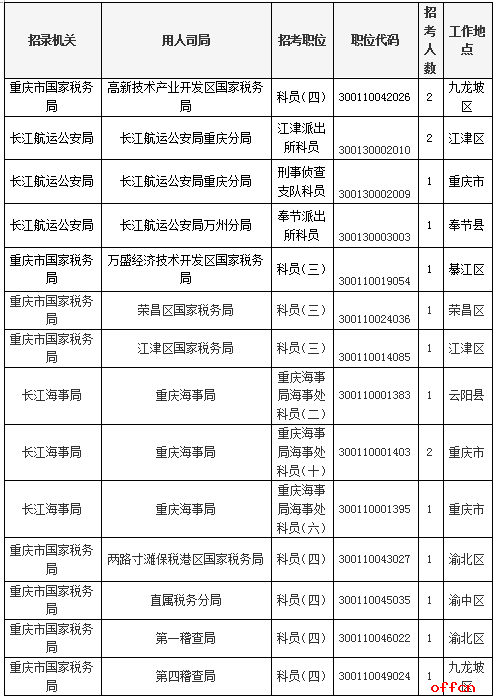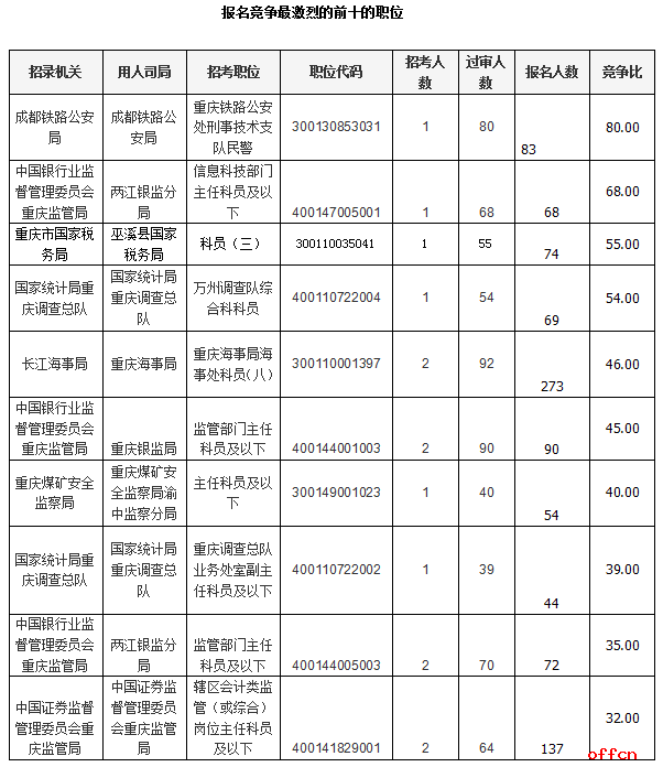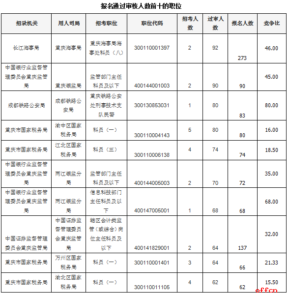 報名通過審核人數(shù)前十的職位主要集中在重慶海事局、重慶銀監(jiān)局、成都鐵路公安局等部門,具體信息如下: