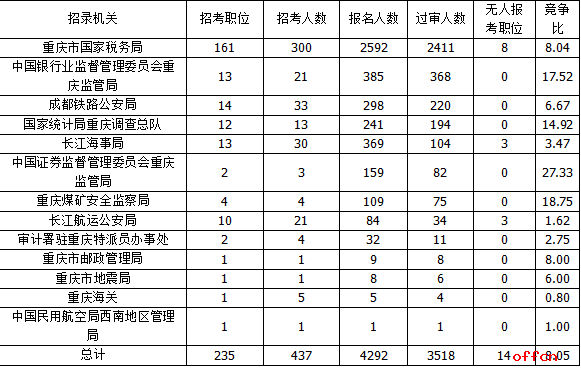 為幫助廣大考生更清晰的了解今日報名情況,中公教育整理了重慶市招錄機關(guān)的招錄情況供廣大考生參考: