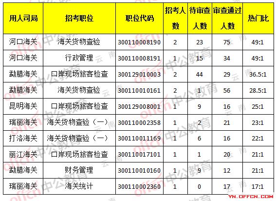 當(dāng)前河口海關(guān)海關(guān)貨物查驗,職位代碼300110008190的崗位相比報名人數(shù)為多,招2人,23人報名待審,75人過審,熱門比為:49:1