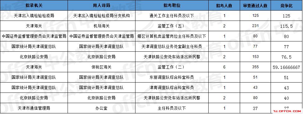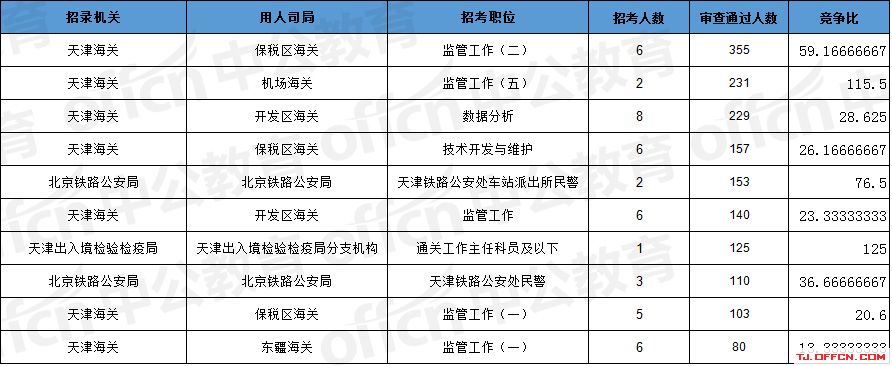 報名通過審核人數(shù)前十的職位主要集中在天津海關(guān)、北京鐵路公安局、天津出入境檢驗(yàn)檢疫局等部門,具體信息如下: