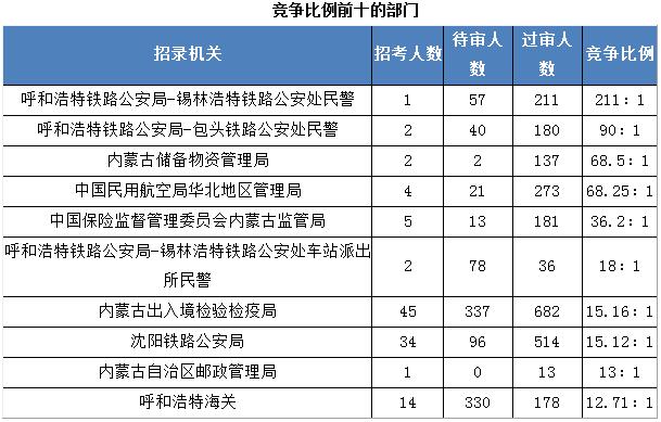 競(jìng)爭(zhēng)比例的部門為呼和浩特鐵路公安局-錫林浩特鐵路公安處民警,招錄1人,截至到2017年11月2日16時(shí),過(guò)審人數(shù)為211人,其次是包頭鐵庫(kù)公安處民警,招錄2人,過(guò)審人數(shù)為180人。