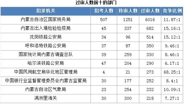 截止到2日16時(shí),通過(guò)審核人數(shù)前三位的部門依次是:內(nèi)蒙古自治區(qū)國(guó)家稅務(wù)局(過(guò)審6016人)、內(nèi)蒙古出入境檢驗(yàn)檢疫局(過(guò)審682人)、沈陽(yáng)鐵路公安局(過(guò)審514人),三部門通過(guò)審核總?cè)藬?shù)達(dá)7212人,占通過(guò)審核總?cè)藬?shù)的70.3%。