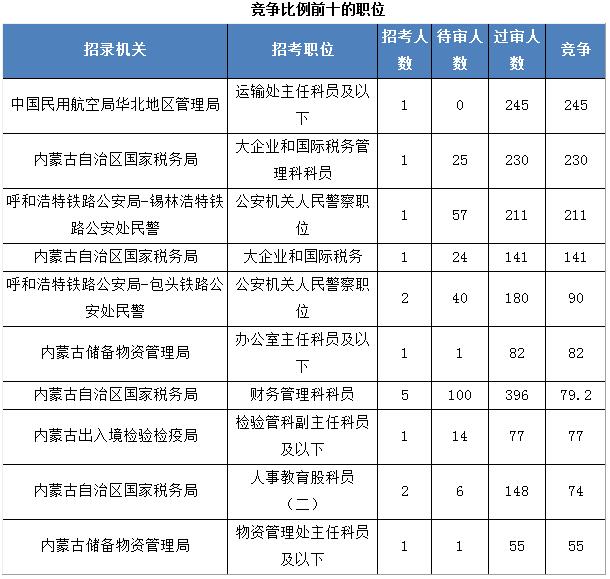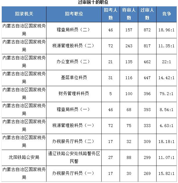 通過審核人數(shù)最多的前十個職位中內(nèi)蒙自治區(qū)國家稅務(wù)局占了9席,其中稽查局科員(二)、 通過審核人數(shù)為872人,管理股科員(二)審核人數(shù)為817人,競爭比例分別為18.96:1與11.35:1.具體信息如下: