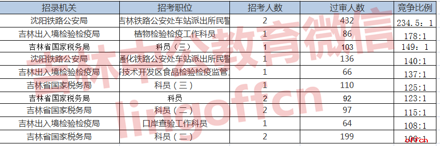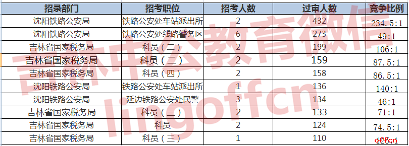 報(bào)名通過審核人數(shù)前十的職位主要集中在沈陽鐵路公安局、吉林國家稅務(wù)局、吉林出入境檢疫檢驗(yàn)局等部門,具體信息如下:
