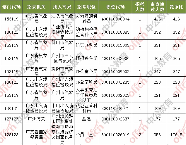 報名通過審核人數(shù)前十的職位主要集中在深圳海關(guān)、廣東省國家稅務局、廣東省氣象局等部門,具體信息如下: