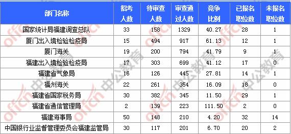 為幫助廣大考生更清晰的了解今日?qǐng)?bào)名情況,福建中公網(wǎng)校專(zhuān)家整理了審核通過(guò)人數(shù)前十位的部門(mén)以及競(jìng)爭(zhēng)比例最激烈的十大部門(mén),供廣大考生參考: