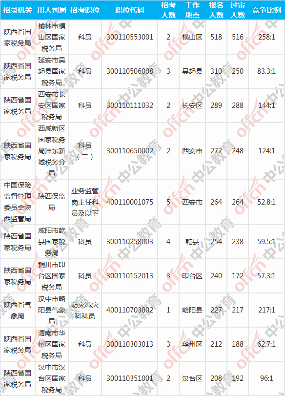 報(bào)名人數(shù)前十的職位主要集中在陜西省國(guó)家稅務(wù)局、中國(guó)保險(xiǎn)監(jiān)督管理委員會(huì)陜西監(jiān)管局、陜西省氣象局等部門(mén),具體信息如下: