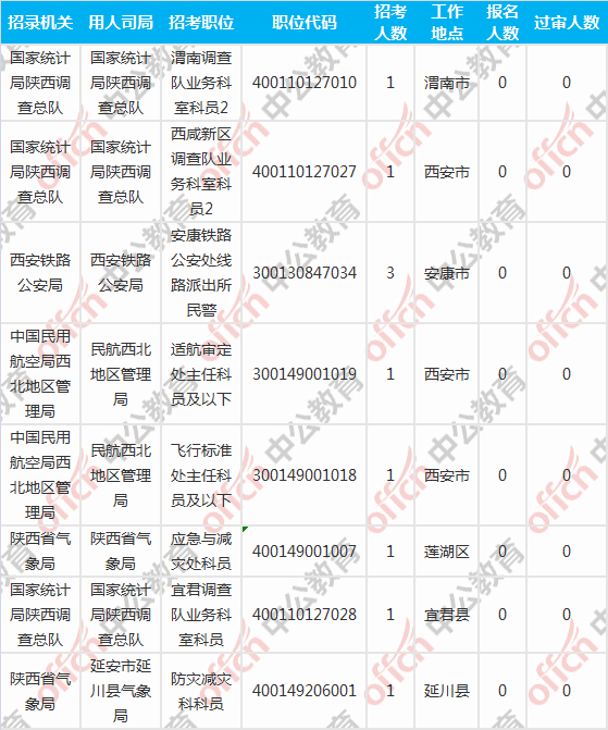 截至到3日16時,工作地點在陜西的職位共有8個無人報考,占全部職位的2.79%。下面是無人報考職位一覽表,中公網(wǎng)校建議廣大考生多關(guān)注一些較冷職位,避免激烈競爭,結(jié)合自身條件,找到屬于自己的職位。