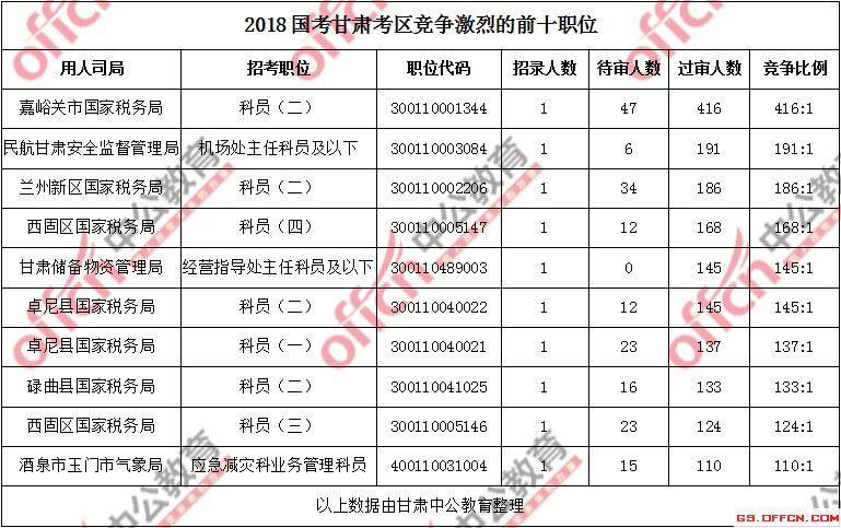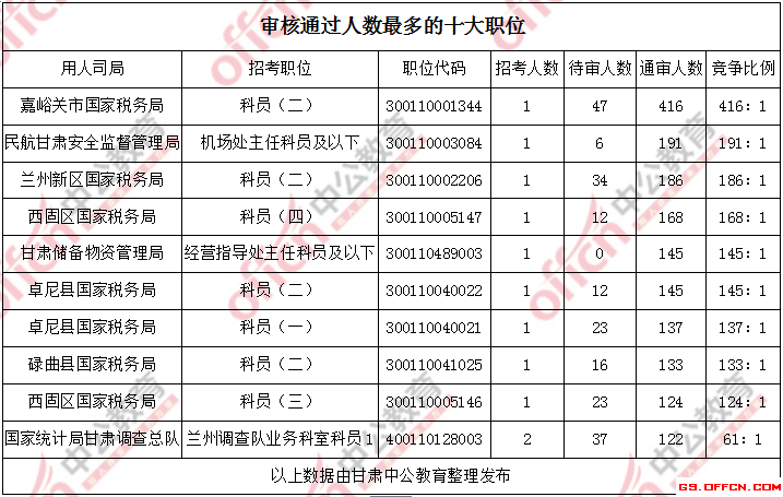 報(bào)名通過審核人數(shù)前十的職位主要集中在嘉峪關(guān)市國家稅務(wù)局、民航甘肅安全監(jiān)督管理局、蘭州新區(qū)國家稅務(wù)局等部門,具體信息如下: