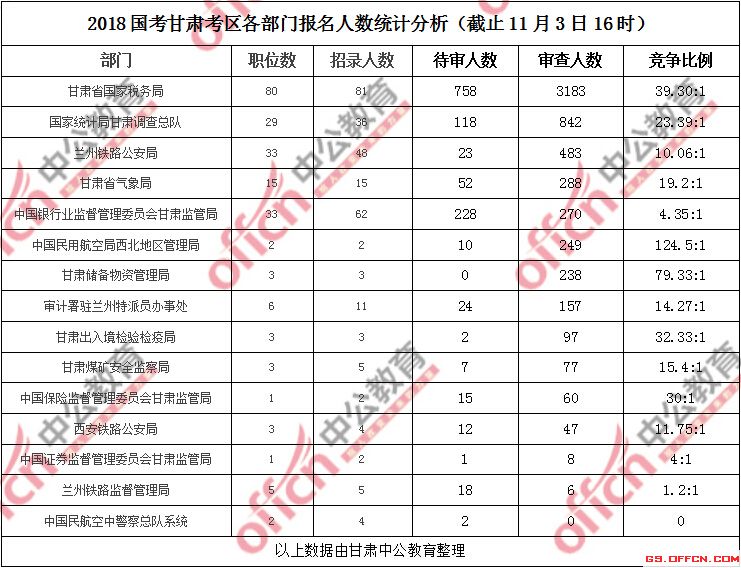 [11月3日16時(shí)]甘肅2018國考報(bào)名人數(shù)統(tǒng)計(jì):過審6005人 最熱競爭比例416:1