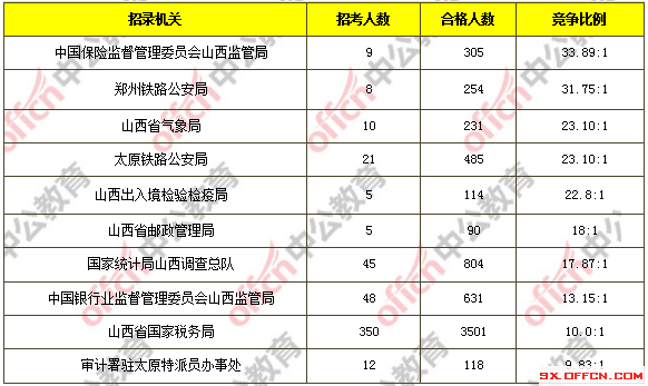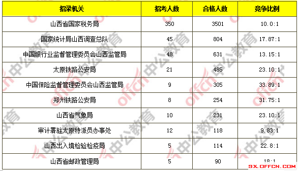 為幫助廣大考生更清晰的了解今日報(bào)名情況,山西中公網(wǎng)校整理了審核通過人數(shù)前十位的部門以及競爭比例最激烈的十大部門,供廣大考生參考: