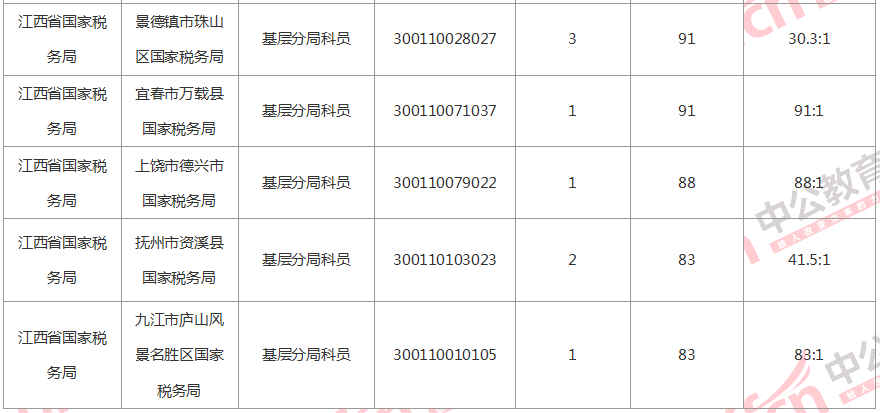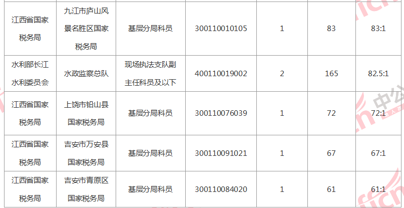 報名通過審核人數(shù)前十的職位主要集中在江西省國家稅務(wù)局、國家統(tǒng)計局江西調(diào)查總隊、水利部長江水利委員會等部門,具體信息如下: