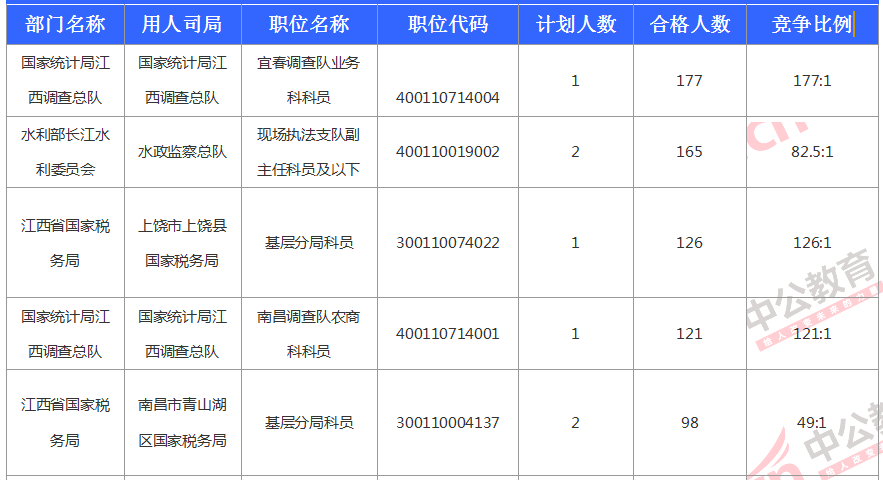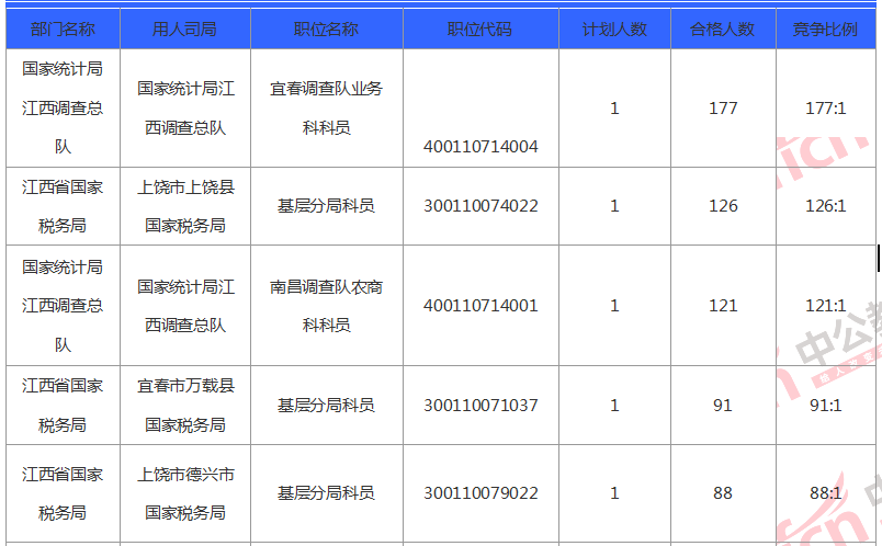 截止到3日16時,競爭比例的職位為國家統(tǒng)計局江西調(diào)查總隊國家統(tǒng)計局江西調(diào)查總隊宜春調(diào)查隊業(yè)務(wù)科科員一職,招錄1人,截止到3日16時通過人數(shù)為177人,位列第二的江西省國家稅務(wù)局上饒市上饒縣國家稅務(wù)局基層分局科員僅126:1
