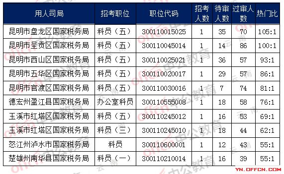 11月03日國考報名第五天,2018國家公務(wù)員考試網(wǎng)絡(luò)報名之際,相比其他部門招考云南省國稅招考人數(shù)相較多,云南中公網(wǎng)校(http://yn.offcn.com/)整理了國考云南省國家稅務(wù)局崗位報名人數(shù)分析如下: