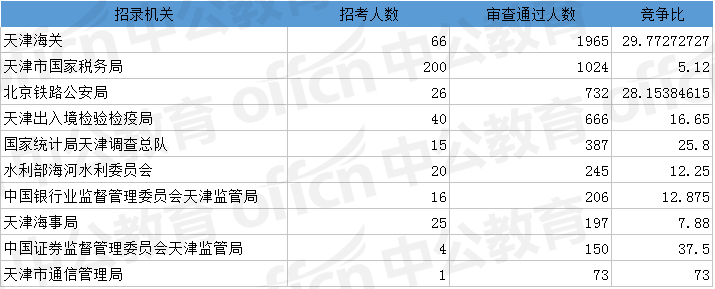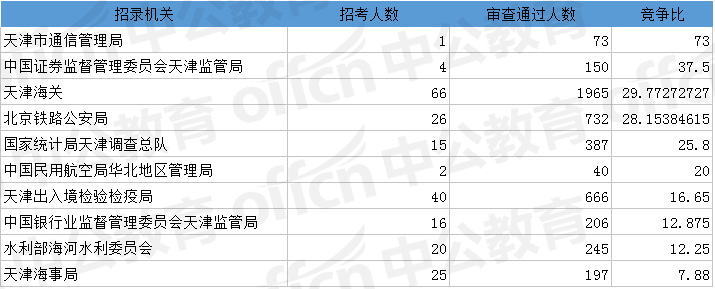為幫助廣大考生更清晰的了解今日報(bào)名情況,中公網(wǎng)校整理了審核通過人數(shù)前十位的部門以及競爭比例最激烈的十大部門,供廣大考生參考: