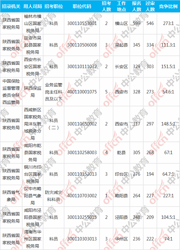 報名人數(shù)前十的職位主要集中在陜西省國家稅務局、中國保險監(jiān)督管理委員會陜西監(jiān)管局、陜西省氣象局等部門,具體信息如下: