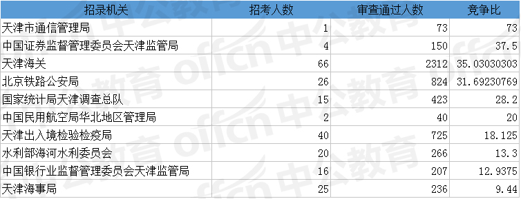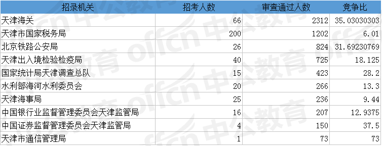 為幫助廣大考生更清晰的了解今日報名情況,中公網(wǎng)校整理了審核通過人數(shù)前十位的部門以及競爭比例最激烈的十大部門,供廣大考生參考: