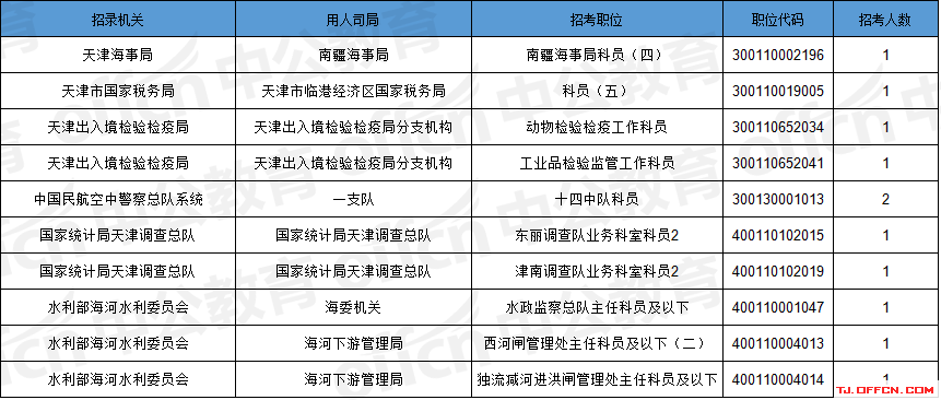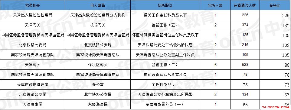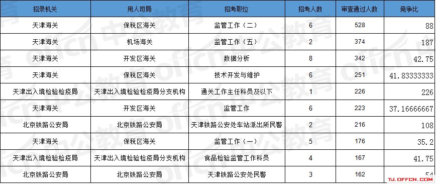 報名通過審核人數(shù)前十的職位主要集中在天津海關(guān)、北京鐵路公安局、天津出入境檢驗(yàn)檢疫局等部門,具體信息如下: