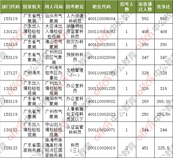 截止到4日16時,競爭比例的職位為廣東省氣象局汕頭市氣象局人力資源科科員一職,招錄1人,截止到3日16時通過人數為592人。