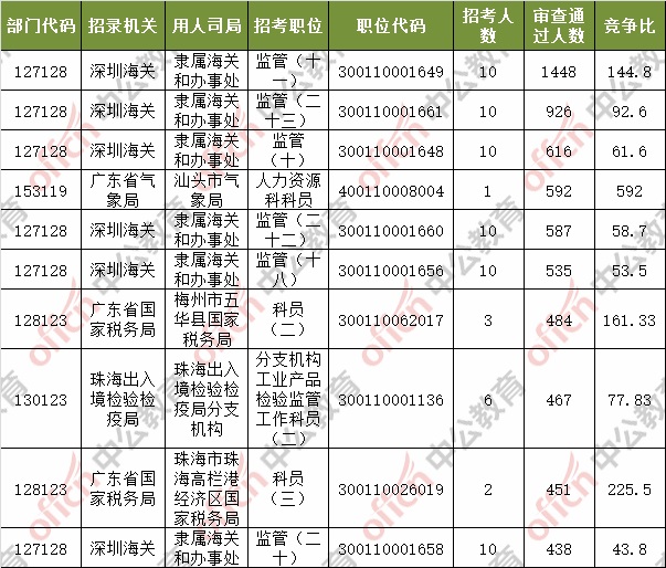 報名通過審核人數前十的職位主要集中在深圳海關、廣東省氣象局、廣東省國家稅務局等部門,具體信息如下: