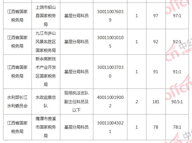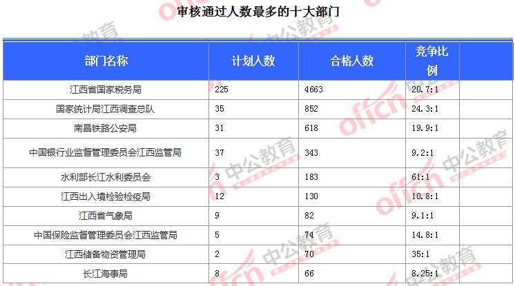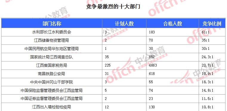 截至11月4日16時(shí),據(jù)中公網(wǎng)校統(tǒng)計(jì),國(guó)考職位中工作地點(diǎn)在江西的職位報(bào)名人數(shù)為8442人,通過(guò)審核總?cè)藬?shù)為7197人,共有4個(gè)職位無(wú)人通過(guò)審核,平均競(jìng)爭(zhēng)比例為19.2:1。