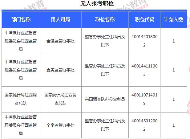 截止到4日16時(shí),工作地點(diǎn)在江西的職位只有4個(gè)無(wú)人報(bào)考,僅占全部職位的1.3%。下面是無(wú)人報(bào)考職位一覽表,中公網(wǎng)校專家建議廣大考生多關(guān)注一些較冷職位,避免激烈競(jìng)爭(zhēng),結(jié)合自身?xiàng)l件,找到屬于自己的職位。