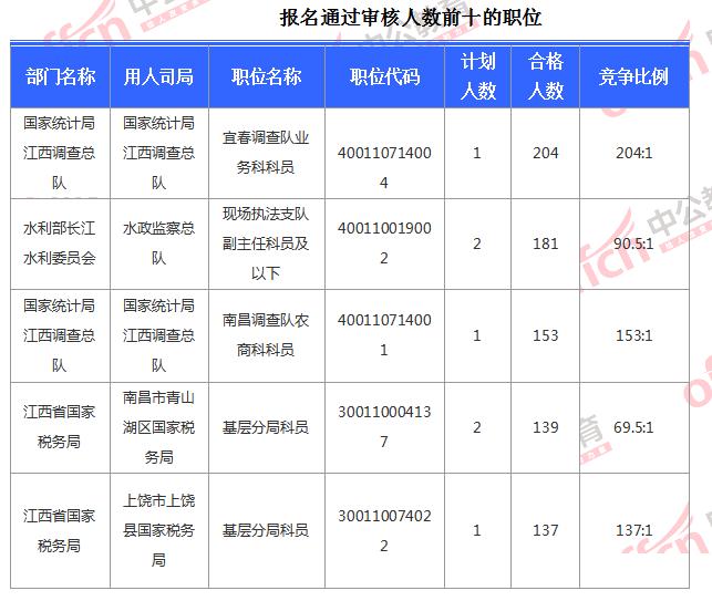 報(bào)名通過(guò)審核人數(shù)前十的職位主要集中在國(guó)家統(tǒng)計(jì)局江西調(diào)查總隊(duì) 水利部長(zhǎng)江水利委員會(huì) 國(guó)家統(tǒng)計(jì)局江西調(diào)查總隊(duì)等部門,具體信息如下: