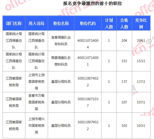 截止到4日16時(shí),競(jìng)爭(zhēng)比例的職位為國(guó)家統(tǒng)計(jì)局江西調(diào)查總隊(duì)國(guó)家統(tǒng)計(jì)局江西調(diào)查總隊(duì)宜春調(diào)查隊(duì)業(yè)務(wù)科科員一職,招錄1人,截止到4日16時(shí)通過(guò)人數(shù)為204人,位列第二的國(guó)家統(tǒng)計(jì)局江西調(diào)查總隊(duì)國(guó)家統(tǒng)計(jì)局江西調(diào)查總隊(duì)南昌調(diào)查隊(duì)農(nóng)商科科員一職,為153:1