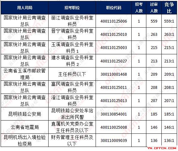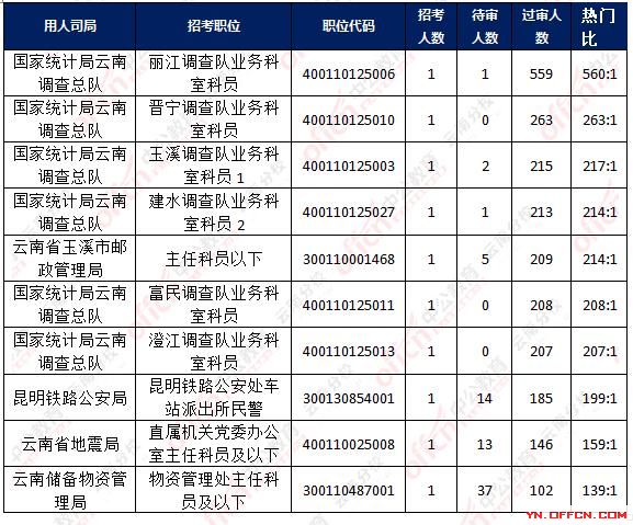 當(dāng)前最受歡迎的崗位是國家統(tǒng)計(jì)局云南調(diào)查總隊(duì),麗江調(diào)查隊(duì)業(yè)務(wù)科室科員,職位代碼:400110125006,招錄1人,560人報(bào)名,其中1人待審核通過,詳情如下圖: