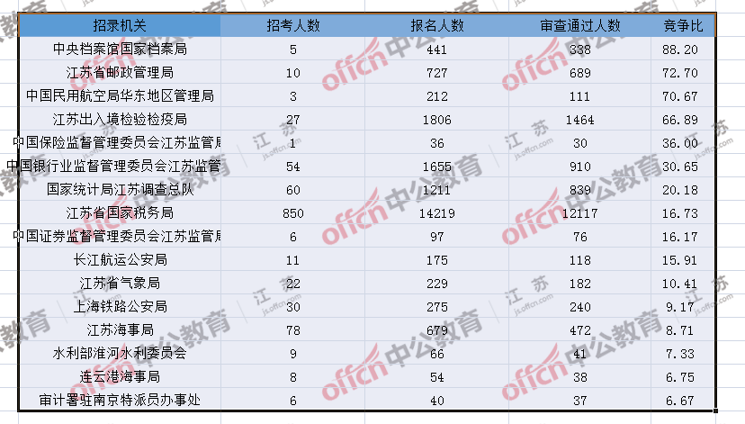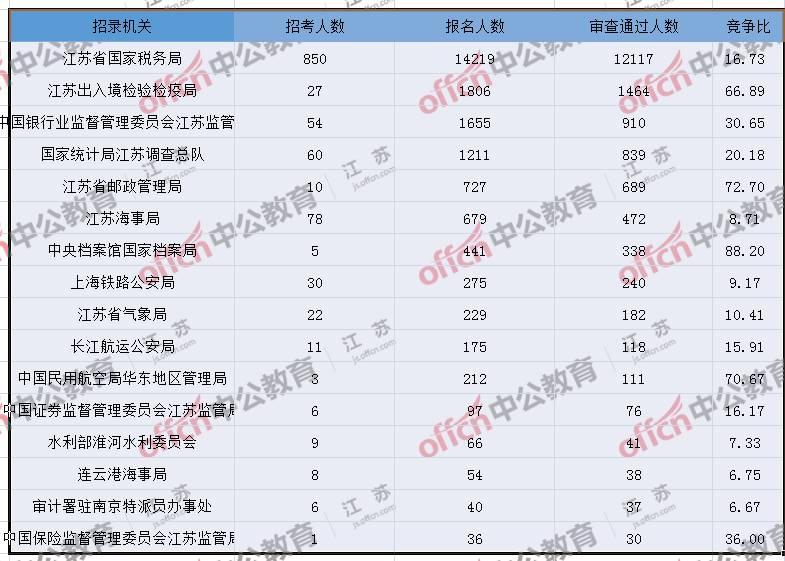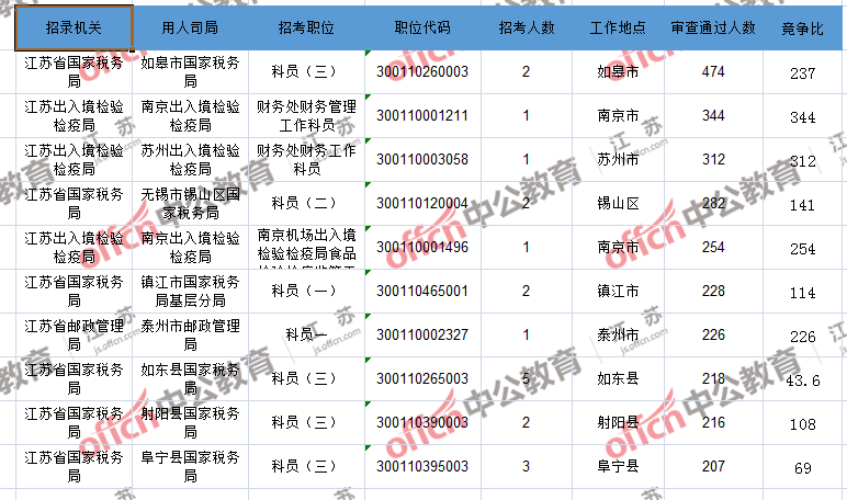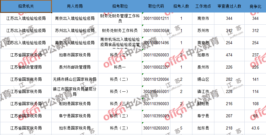 報(bào)名通過(guò)審核人數(shù)前十的職位主要集中在江蘇出入境檢驗(yàn)檢疫局、江蘇省郵政管理局、江蘇省國(guó)家稅務(wù)局等部門(mén),具體信息如下: